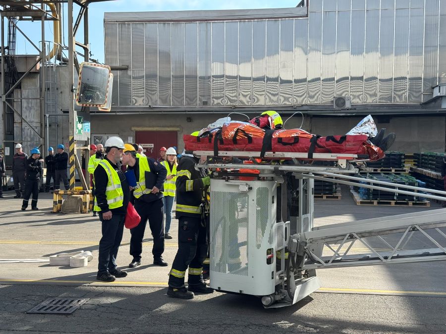 Na místo dorazily tři hasičské vozy, které si ve spolupráci s našimi zaměstnanci vyzkoušely zásah při simulovaném požáru v hale. Součástí cvičení byla také záchrana zraněné osoby ze střechy výrobní haly, což prověřilo koordinaci a efektivitu zásahu v náročnějších podmínkách.